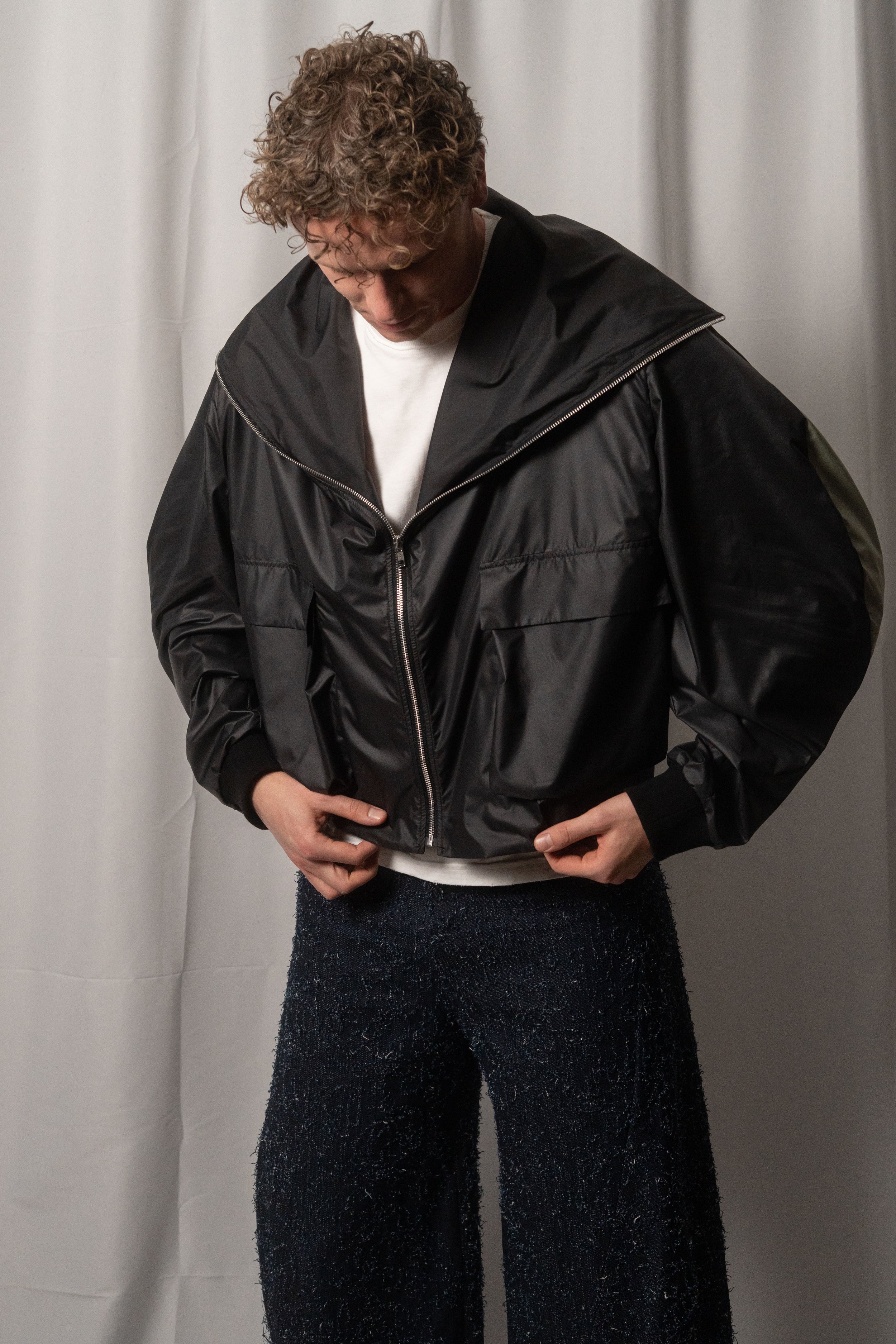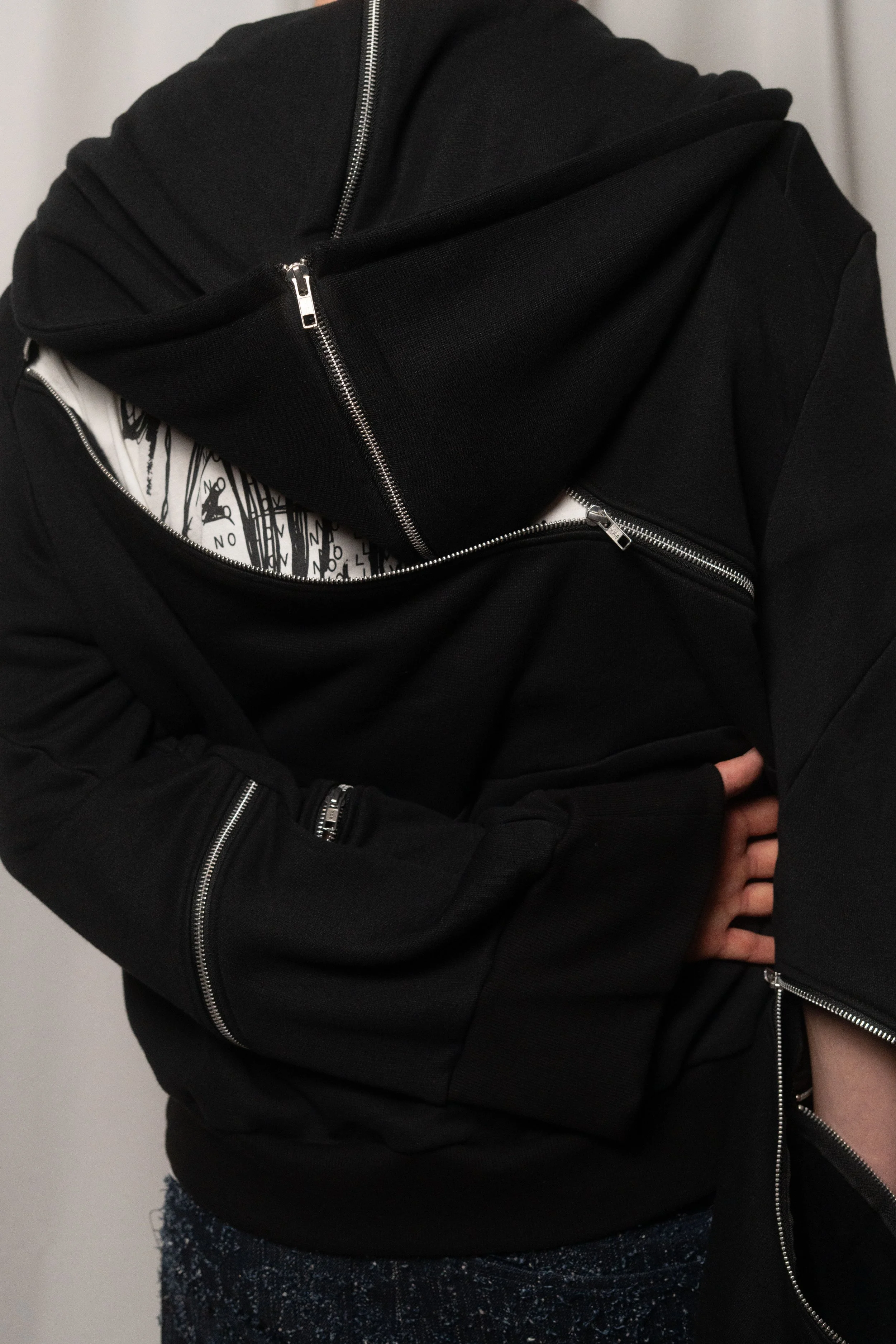 Denim evolves with washing, zips open, layers detach, shapes reconfigure.